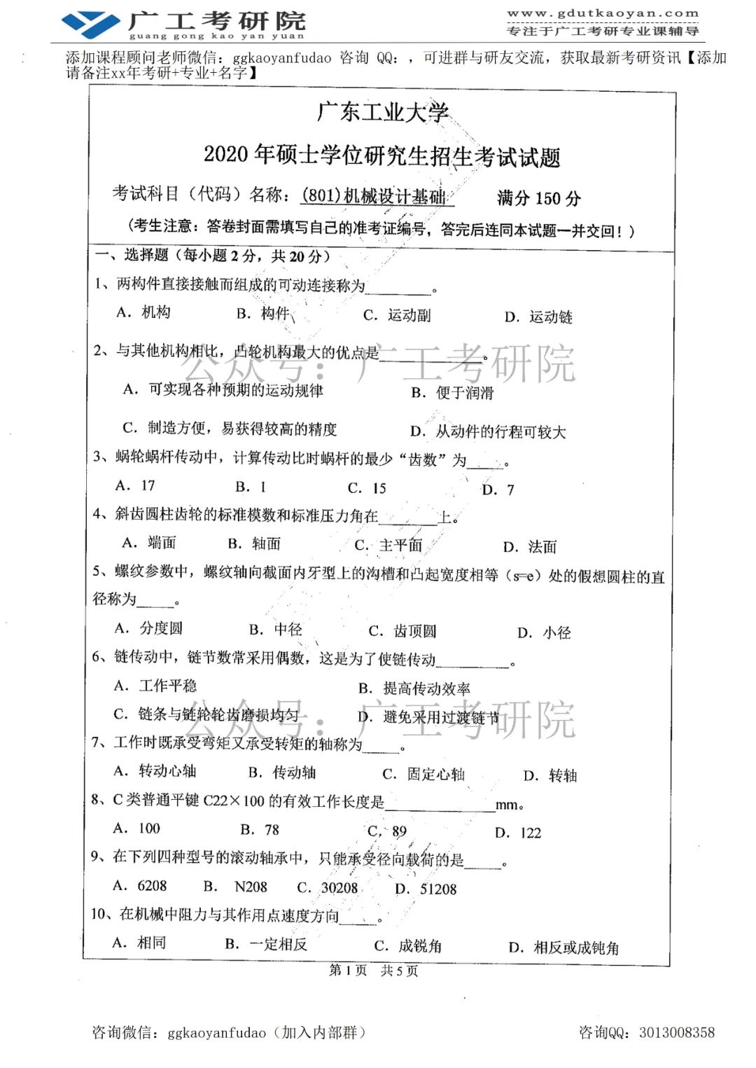 今天我们看看【2020年广东工业大学801机械设计基础考研真题】。欲想获取更多广工考研真题,可添加课程顾问微信,备注【真题】即可获取。